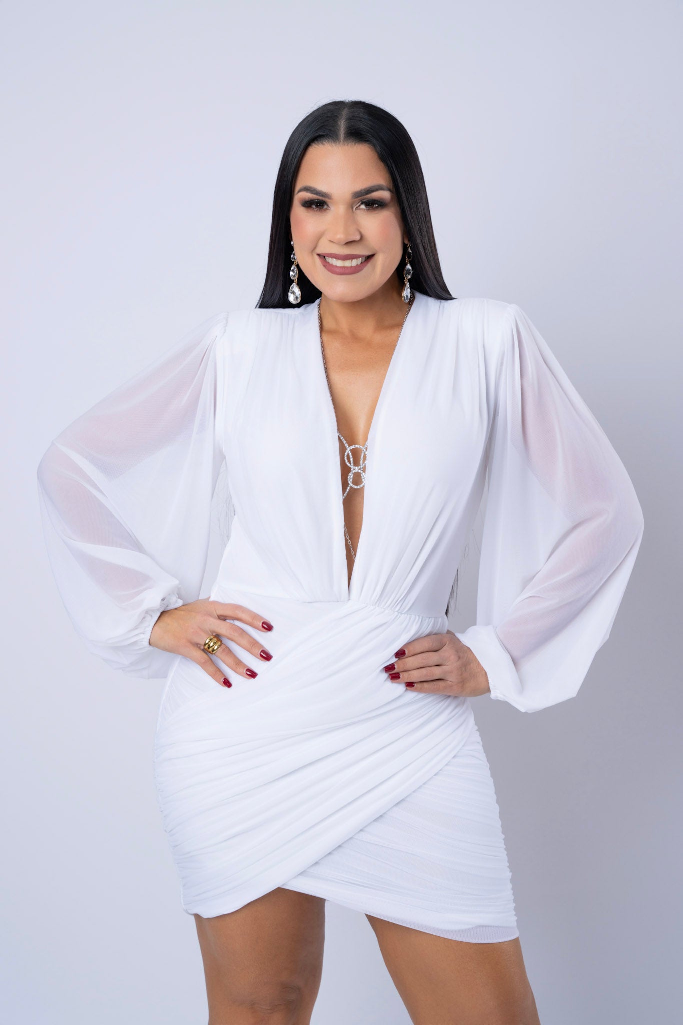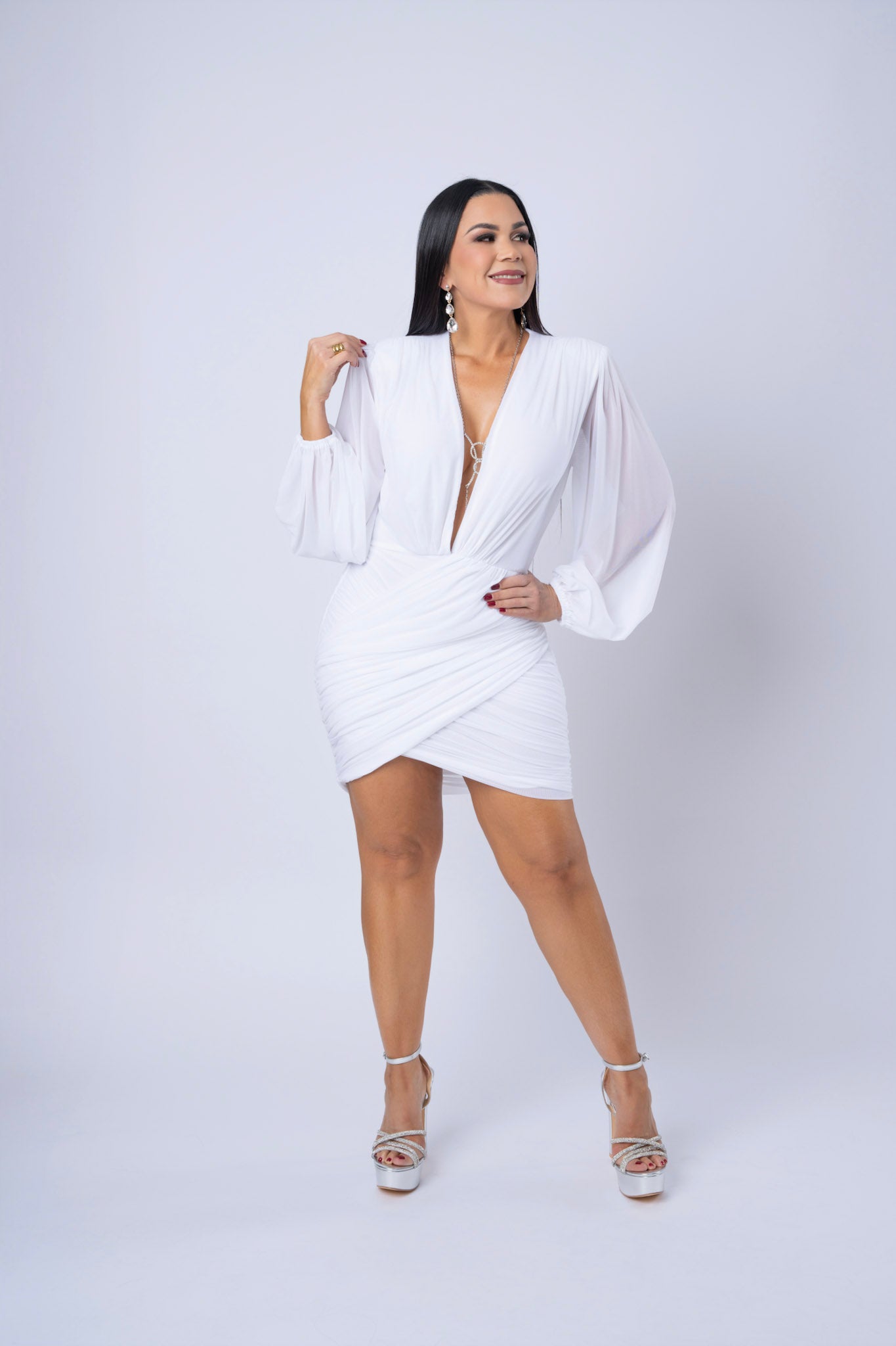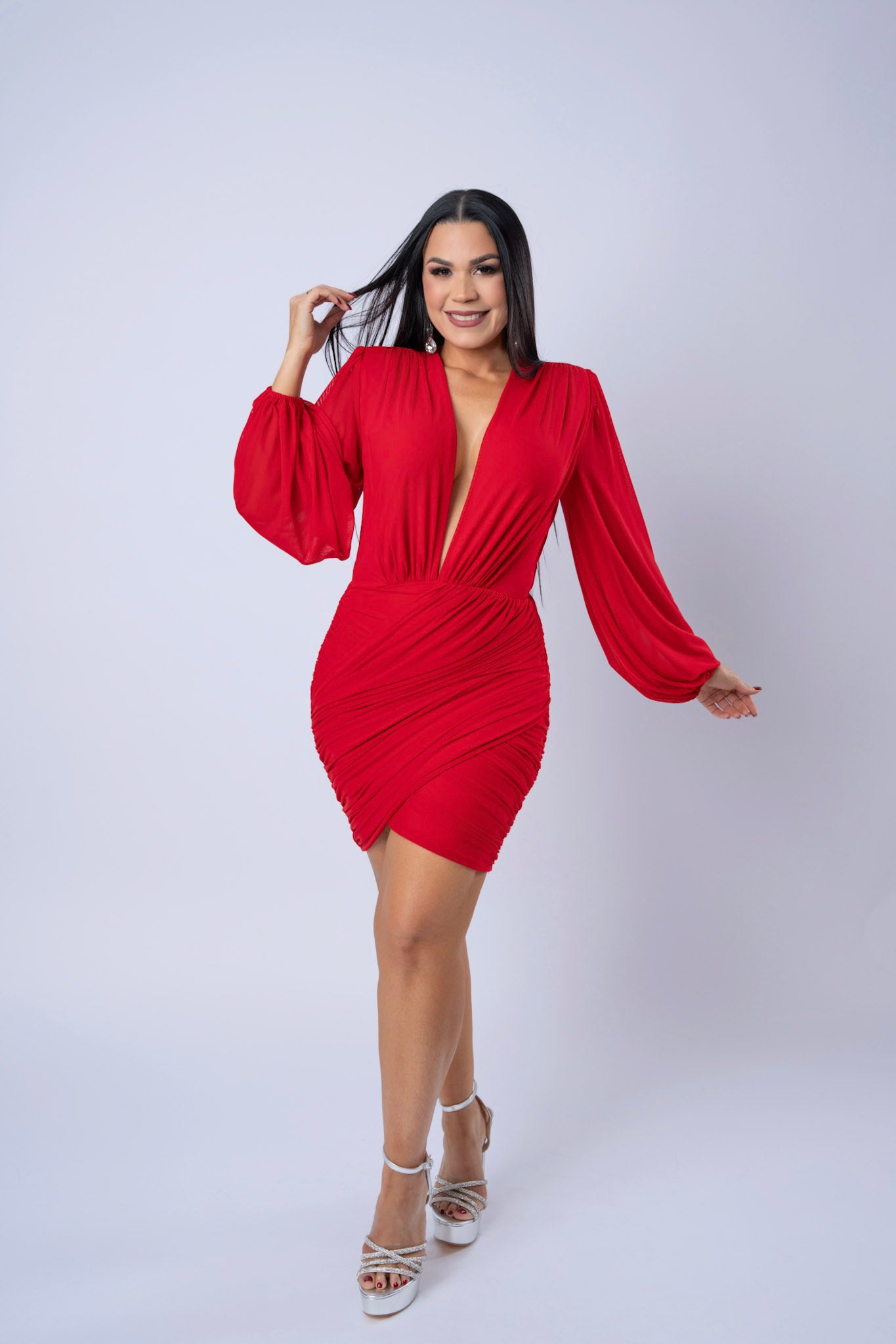 Rushed Mesh Mini Dress With Long Sleeves And Deep V-Neckline.
