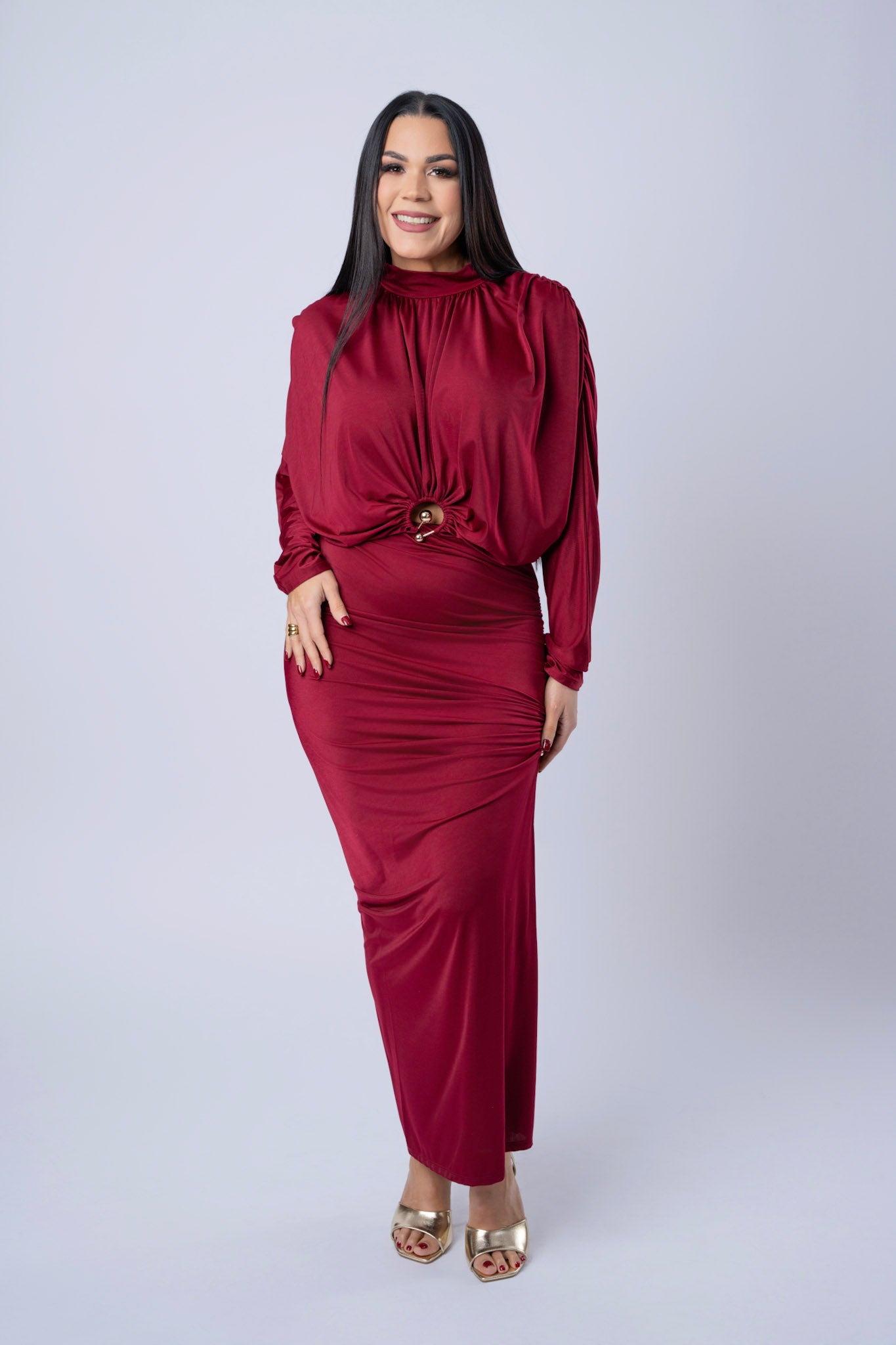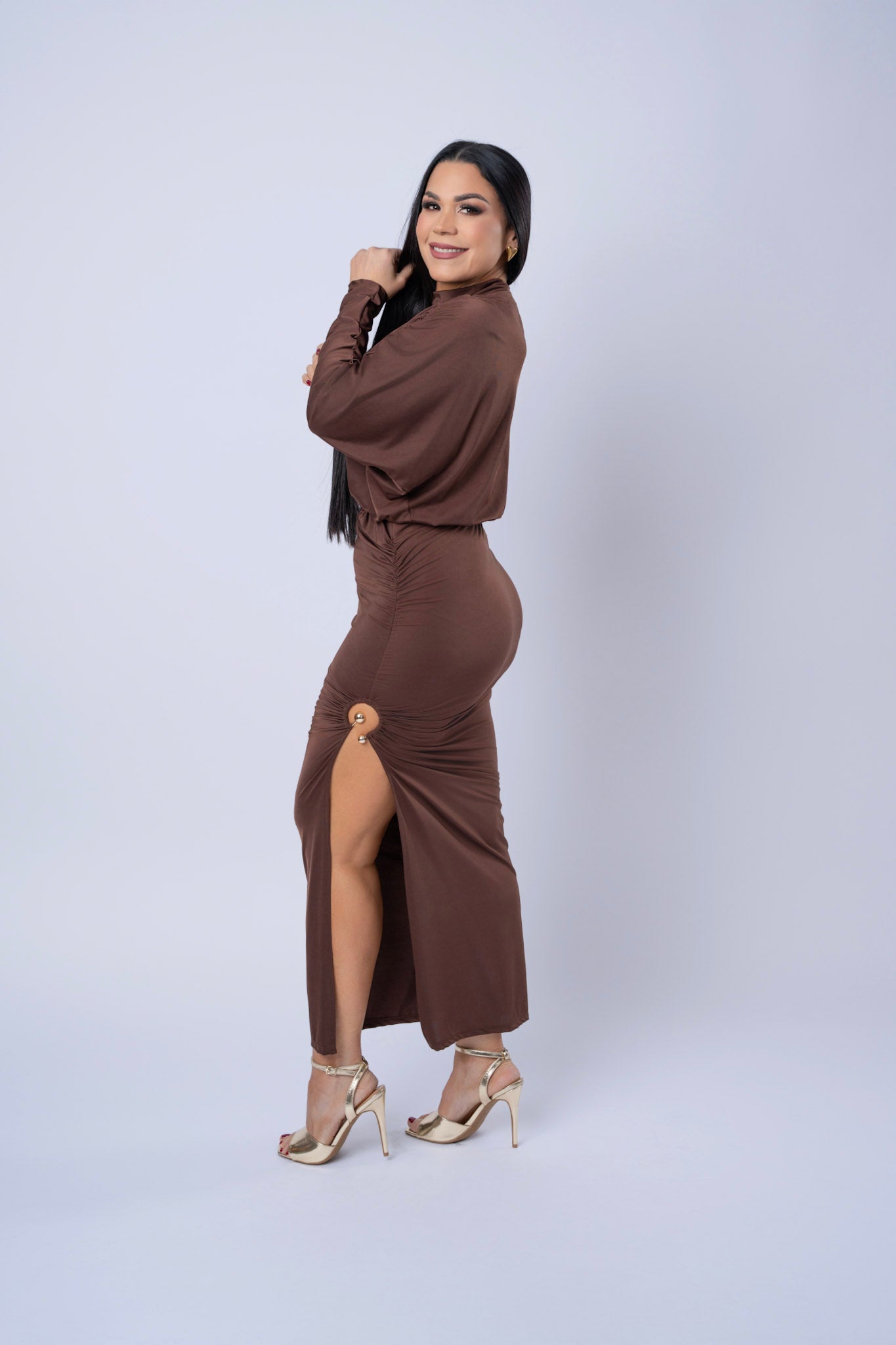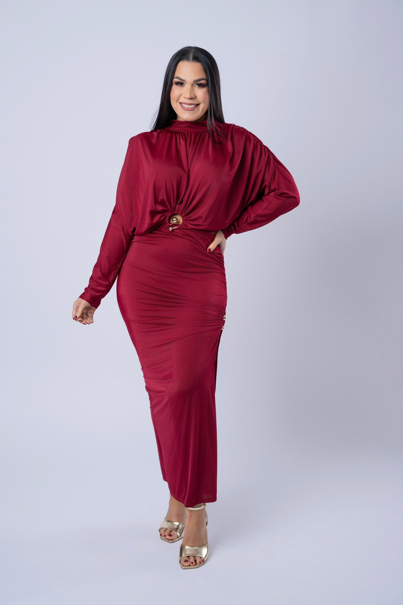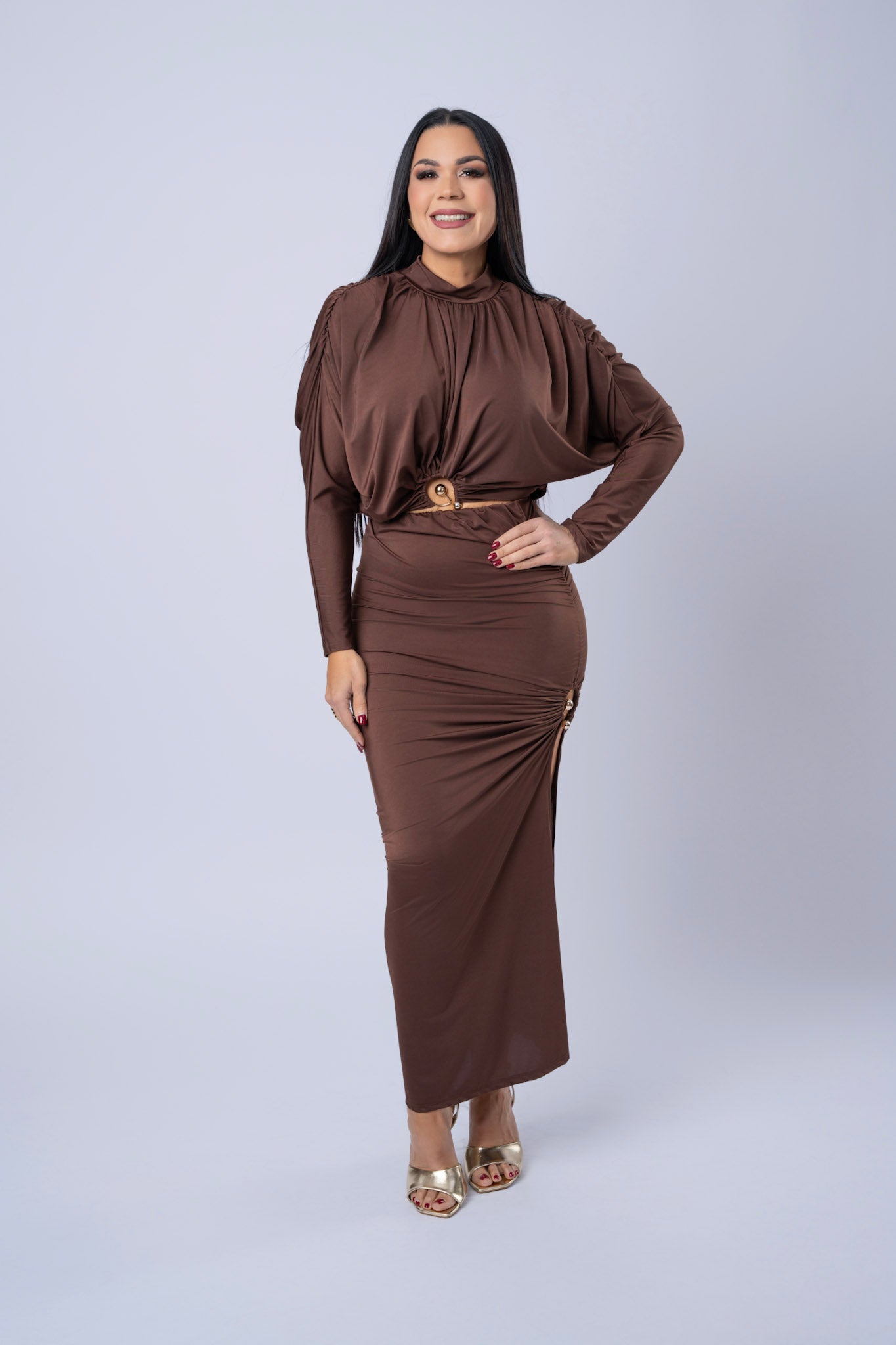 Rushed Long Sleeve Crop Top And Slit Skirt Set.
