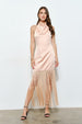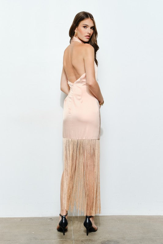 Fringe Hem Satin Cowl Halter Maxi Dress.
