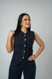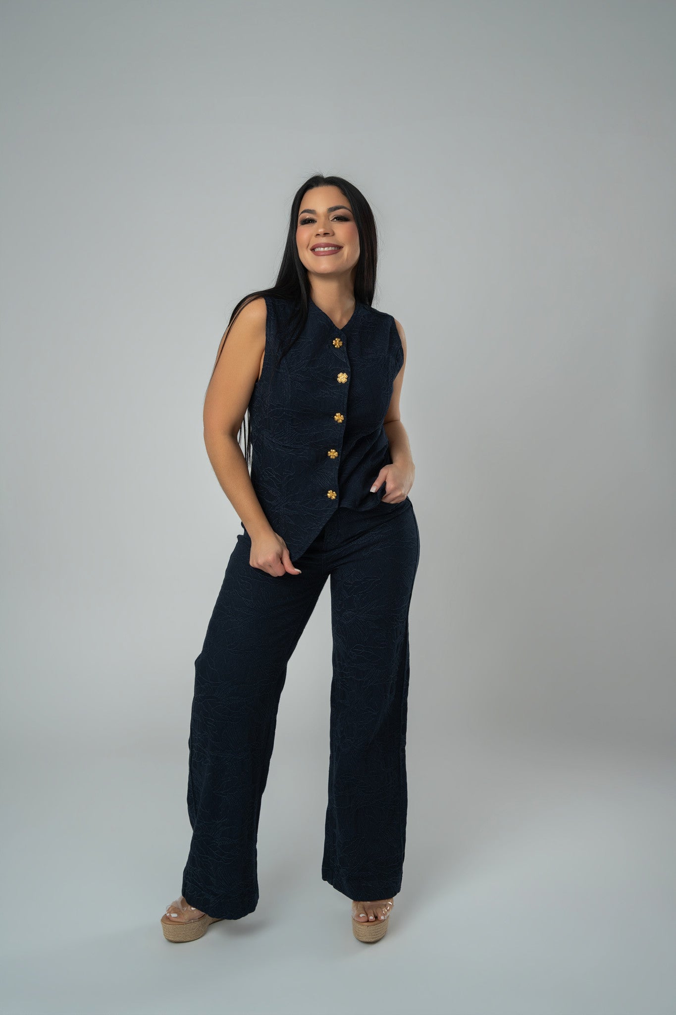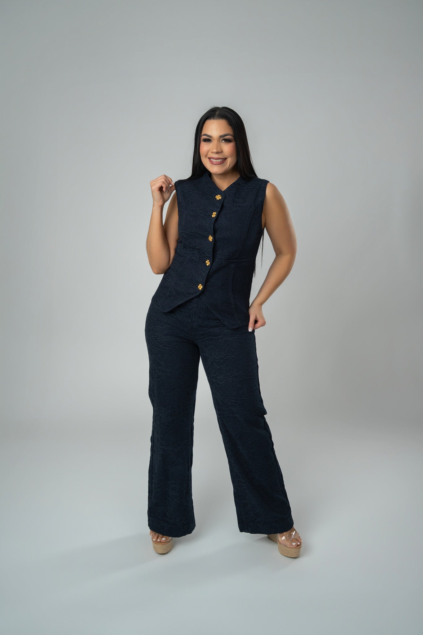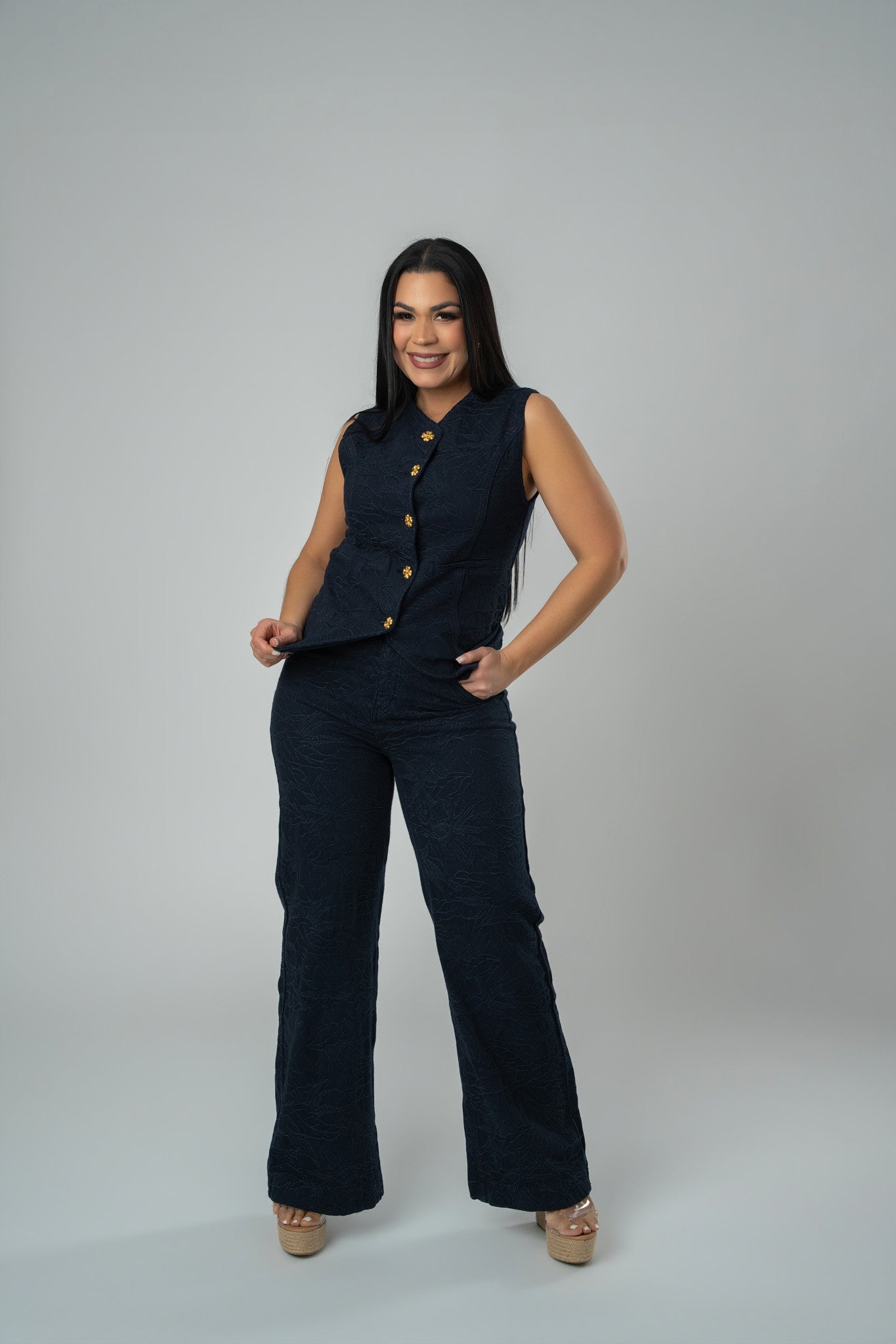Embroidered Sleeveless Denim Vest & Wide Leg Pants Set With Golden Clover Bottom Detail.