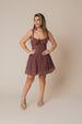 Mini Dress With Corset Bodice, Gathered Bust, Adjustable Bow At Front, Thick Straps, Gathered Skirt, And Back Zipper.
