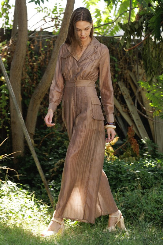 Semi-Sheer Long-Sleeved Satin Jumpsuit With Belt, Pleats, Flap Pockets And A Wide Structured Waistband.