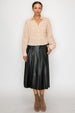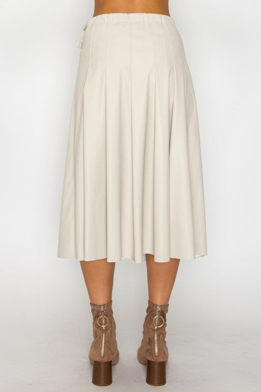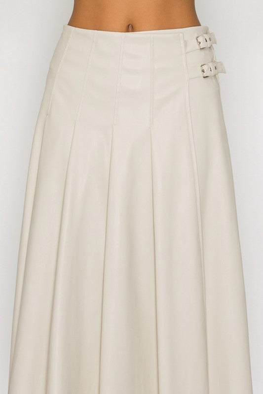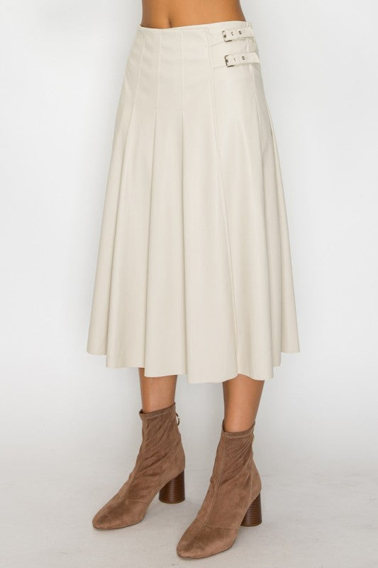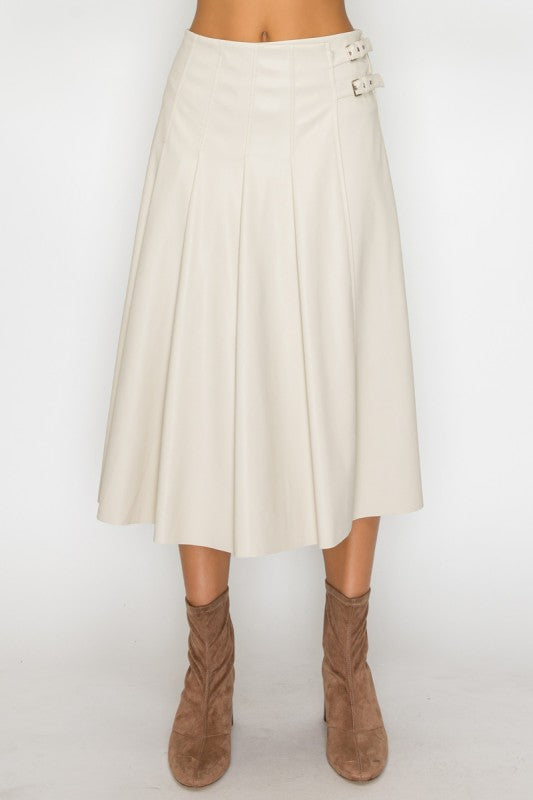 Midi Faux Leather Flare Skirt With Classic Elegance Featuring High Rise Waistband, Side Buckle Detail, Pleated, A-Line Silhouette, And Solid Color.