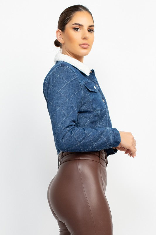 Crop Denim Jacket Featuring A Basic Collar With Fur, Buttoned Long Sleeves, Flap