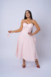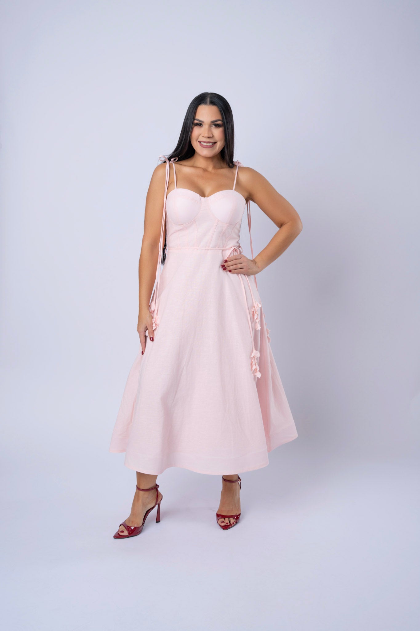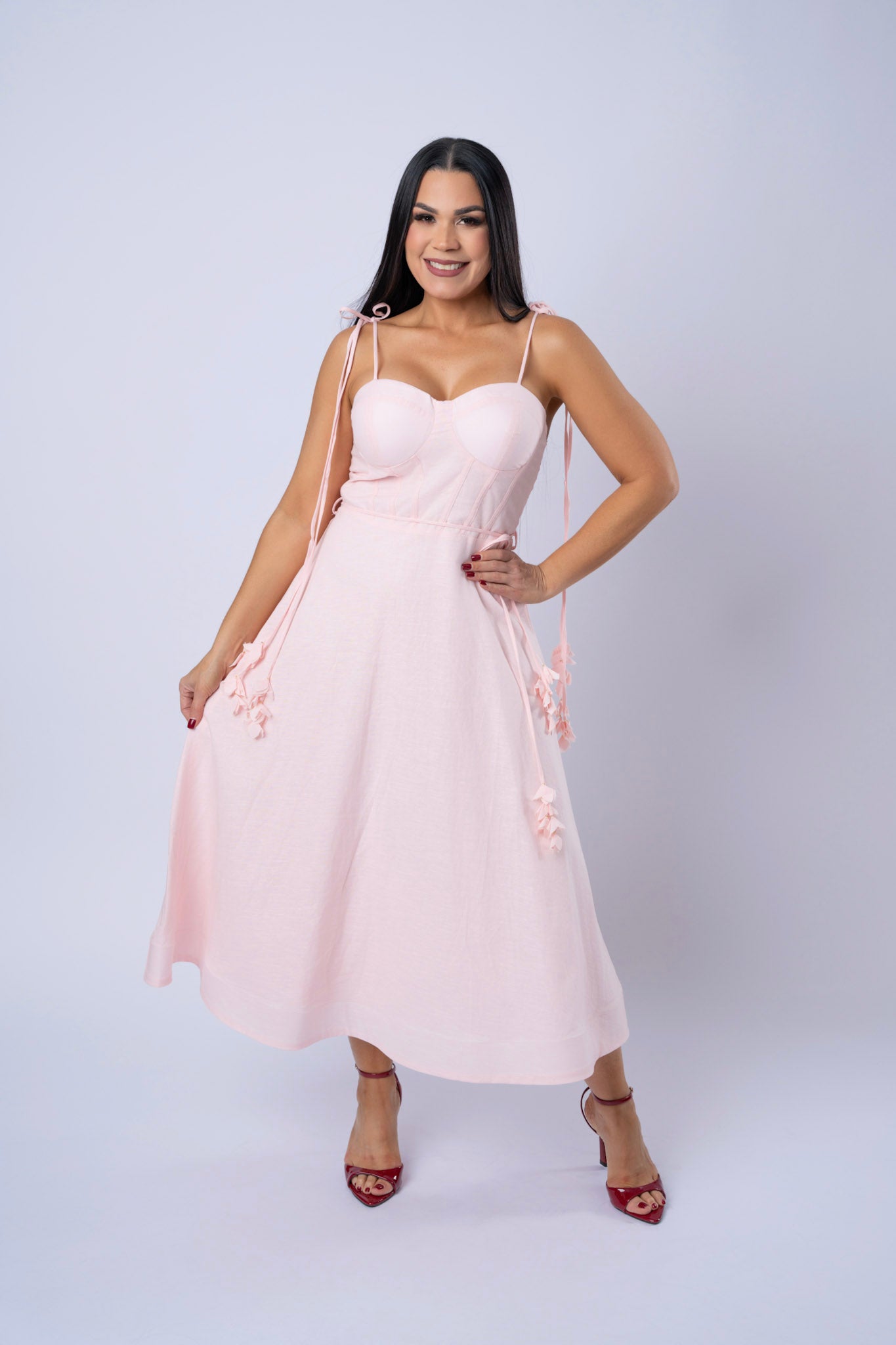 Midi Corset Dress, Designed With Corset-Style Bodice, Adjustable Straps With Floral Details, Rushed Back And A-Line Skirt.