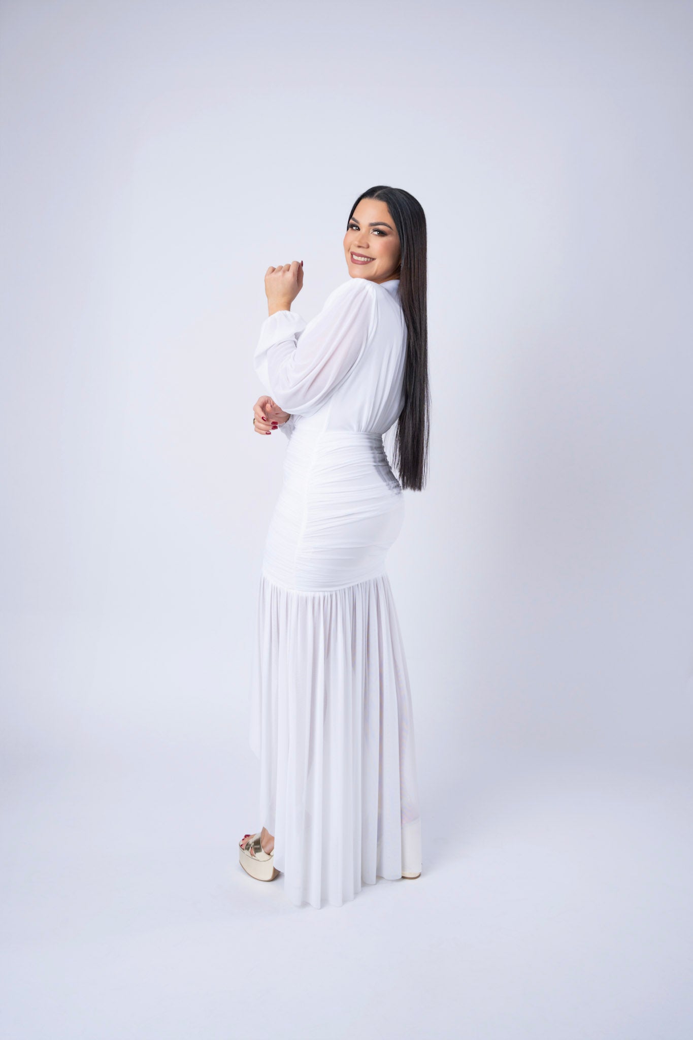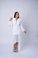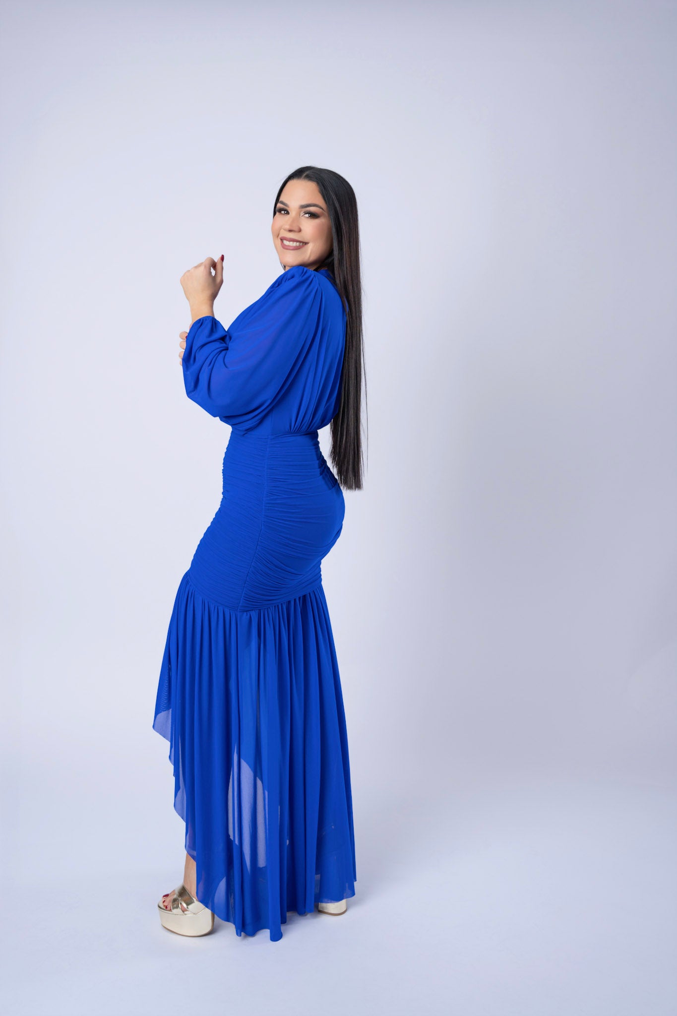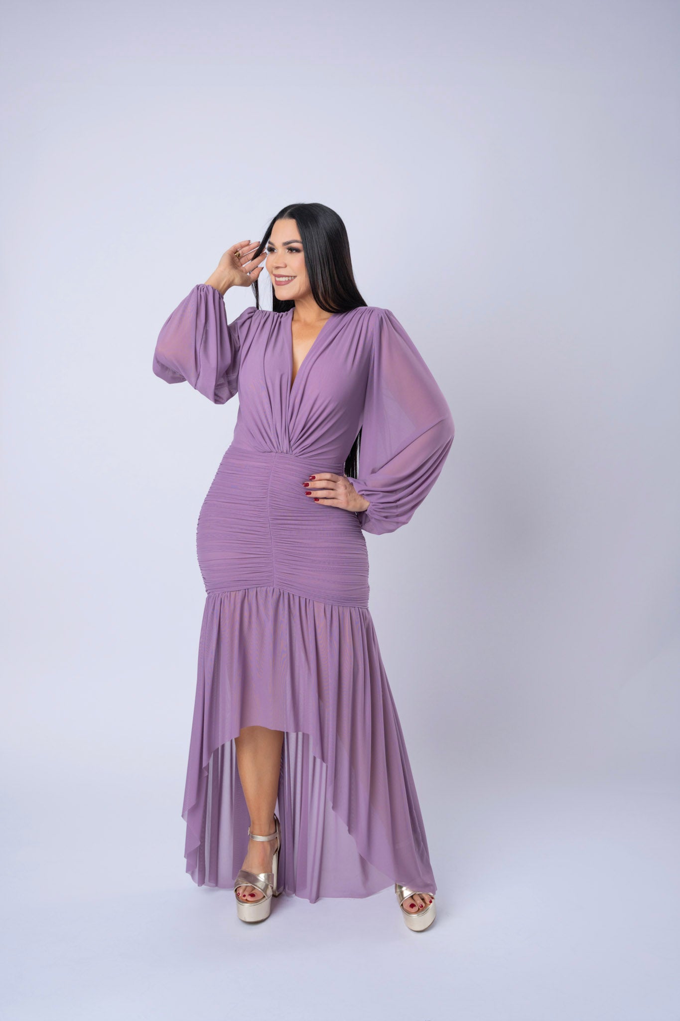 Rushed Mesh Long Sleeve High- Low Dress.