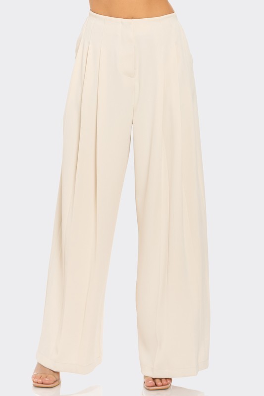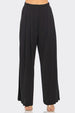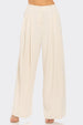 High Waisted Pleated Wide Leg Trousers With Front Pockets, Back Elastic Waistband, And Back Pocket Slits.