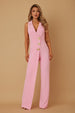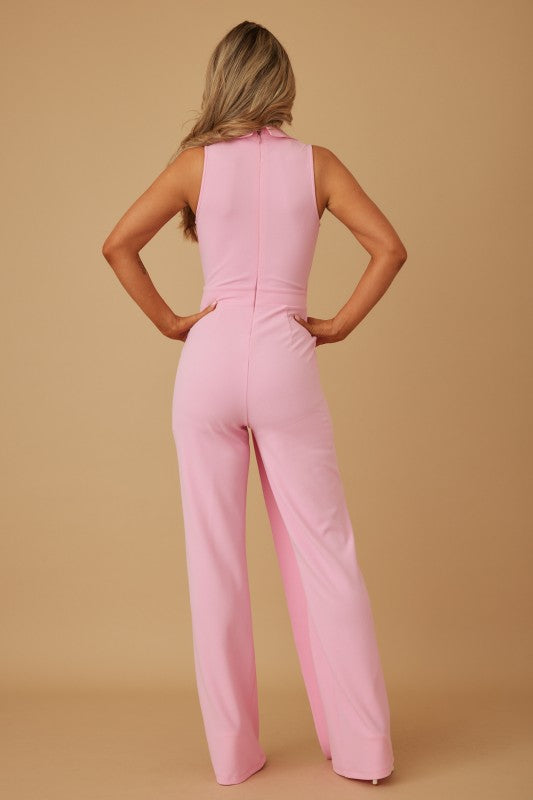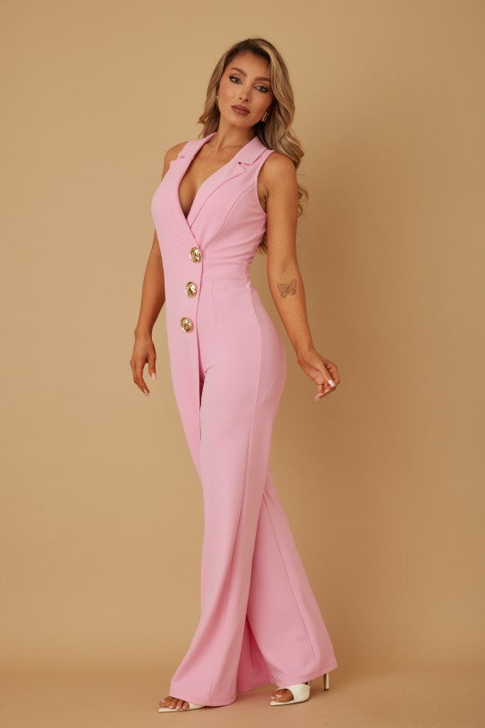 Sleeveless Jumpsuit With A Blazer-Style Overlay, Sleeveless Design, Gold Button Detail, And Back Zipper Closure.