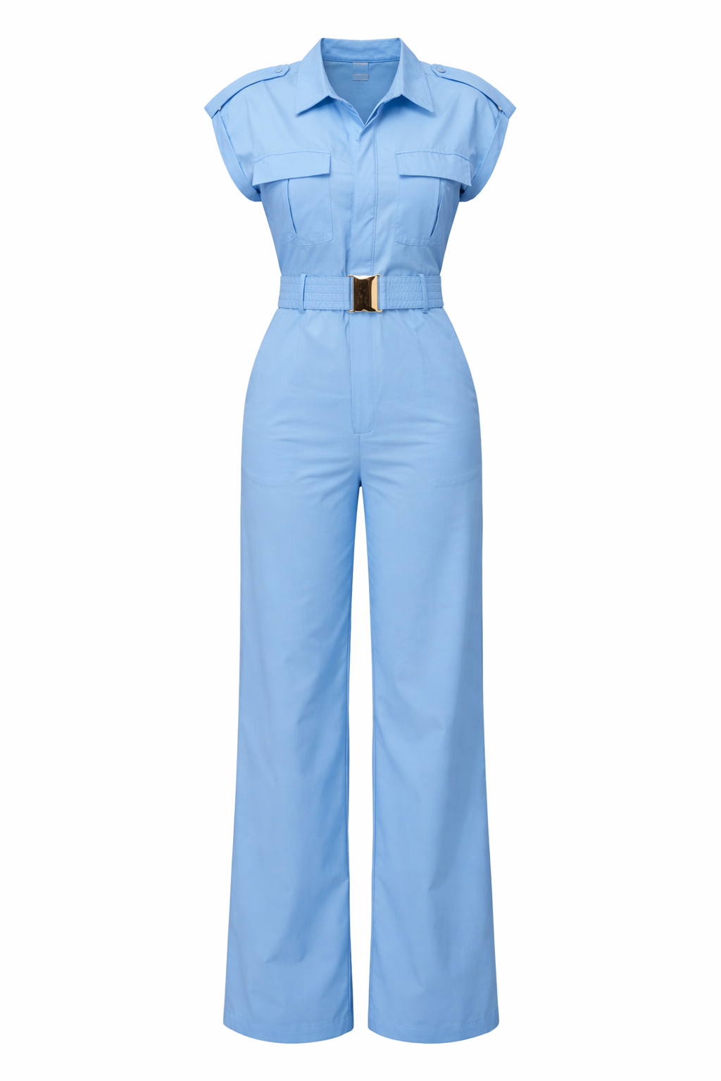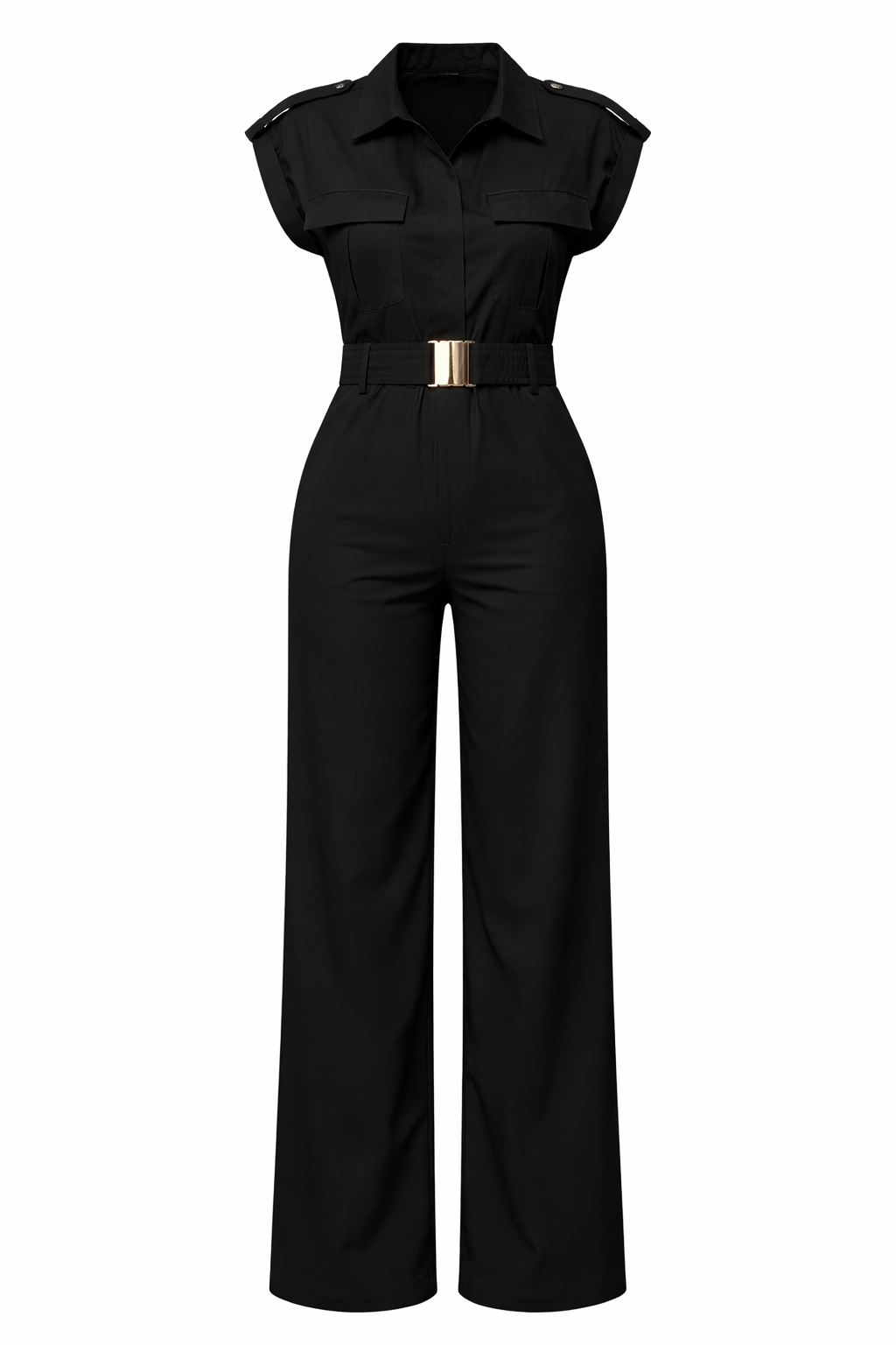 Wide-Legged Jumpsuit, Short Sleeves, Shirt Collar, Flap Pockets And A Belt With A Gold Buckle.